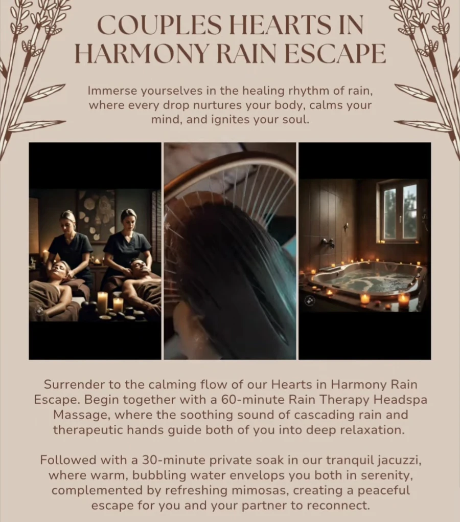 Indulge in a shared journey of relaxation and connection with our Hearts in Harmony Rain Escape.